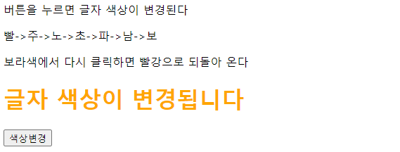 <!--버튼을 누르면 글자 색상이 '빨->주->노->초->파->남->보' 순서로 변경되는 코드입니다.-->