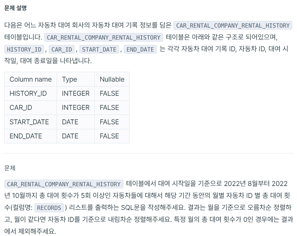 3. 대여 횟수가 많은 자동차들의 월별 대여 횟수 구하기(문제 잘못 이해해서 오래걸림ㅠㅠ)