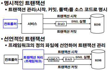 두가지 트랜잭션 처리 구현 방법이 존재한다. 비즈니스 로직 안에서 트랜잭션의 시작과 끝을 소스코드로 명시하는 명시적인 트랜잭션과 AOP를 활용하여 스프링이 제공하는 기능을 사용하는 선언적 트랜잭션이다.