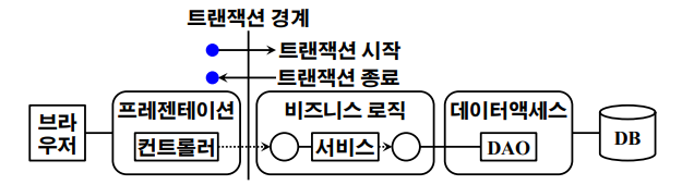 스프링 프레임워크에서 트랜잭션의 경계는 프레젠테이션 층과 비즈니스 로직층 사이에 있다.