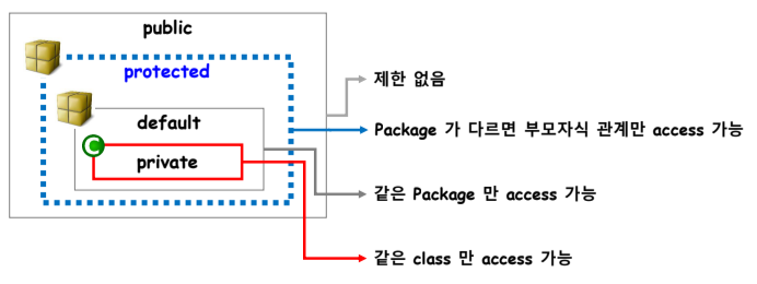 - 이렇듯 특정 부분의 접근을 제한하는 것을 캡슐화(Encapsulation)라고 함