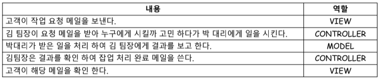 | Controller | 요청한 내용을 확인하여 해당 업무를 수행할 Model에게 전달 | JAVA |
