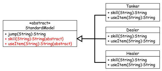 - 모든 클래스는 skill()과 useItem()은 반드시 구현해야 하는 상황