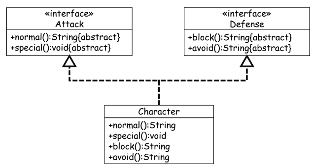 public class Character implements Attack, Defense { //Attack, Defense 인터페이스를 implements로 다중 구현했습니다.