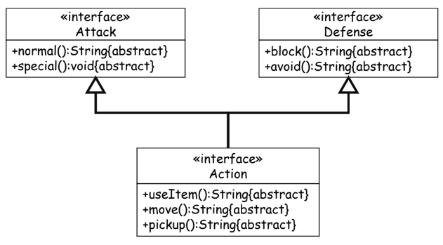 - Action만 구현받았지만 Action이 상속받은 Attack과 defense의 추상 메서드도 구현됨