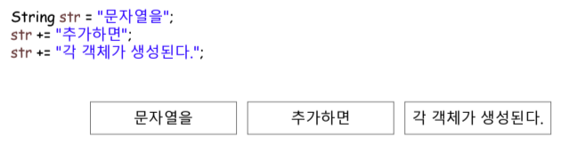 용량이 고정되기 때문에 문자열 추가 시(+=) 새로운 객체를 계속 생성함