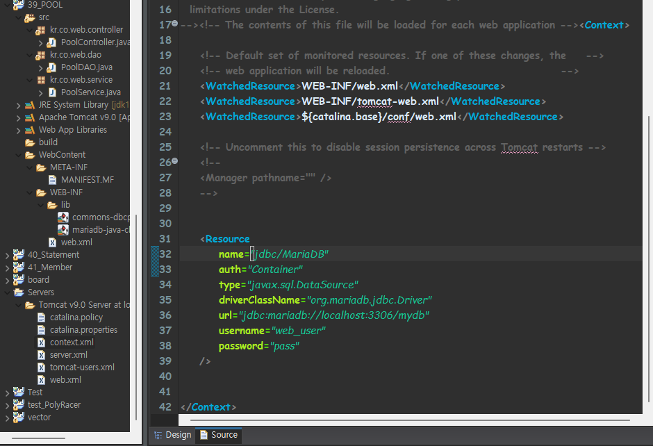 - Servers/Tomcat/context.xml에 사용할 Resource 저장 후 불러오는 방식