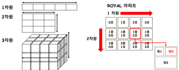 - 다차원 배열의 개념을 아파트와 방의 개념으로 생각 ex) [1층][2호][방0]