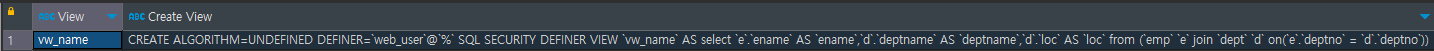show create view vw_name; -- 특정 뷰에 대한 정보(뷰를 생성한 쿼리문)